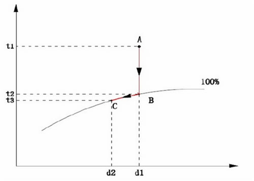 過熱狀態A冷卻至飽和狀態B,飽和狀態B繼續冷卻至飽和狀態C。由A至C過程中,含濕量由d1降到d2。