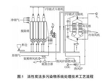 為了降低燃?xì)獾氖褂昧,可以采取煙氣循環(huán)燒結(jié)(如圖4所示),可減少約25%的煙氣排放量,相應(yīng)降低加熱煙氣所需的燃?xì)饬,同時(shí)降低脫硫及脫硝的投資建設(shè)成本2.2活性炭法多污染物協(xié)同處理技術(shù)活性炭吸附法技術(shù)工藝簡(jiǎn)單,占地面積小,是一種可同時(shí)去除粉塵、Nox、SO2等多污染物的煙氣凈化技術(shù),且該技術(shù)資源化利用率高,副產(chǎn)物為高濃度SO2氣體,可用于制備濃硫酸或其它高附加值的單質(zhì)硫等,具有良好的發(fā)展前景。 活性炭多污染物協(xié)同處理技術(shù)由吸附系統(tǒng)、解析系統(tǒng)、輸送系統(tǒng)和硫資源化利用系統(tǒng)組成。煙氣由增壓風(fēng)機(jī)引入吸附塔,氨氣在吸附塔入口加入,SO2、Nox、粉塵、二噁英、重金屬等污染物脫除在吸附塔內(nèi)完成。吸收了污染物的的活性炭通過輸送系統(tǒng)送往解析塔,在430℃氮?dú)鈿夥障聦?duì)活性炭進(jìn)行加熱解析,產(chǎn)生富含SO2氣體,同時(shí)可以分解約70%的二噁英,活性炭經(jīng)篩分后重新利用,篩下物可送往高爐或燒結(jié)作為燃料使用,工藝流程如圖5所示。