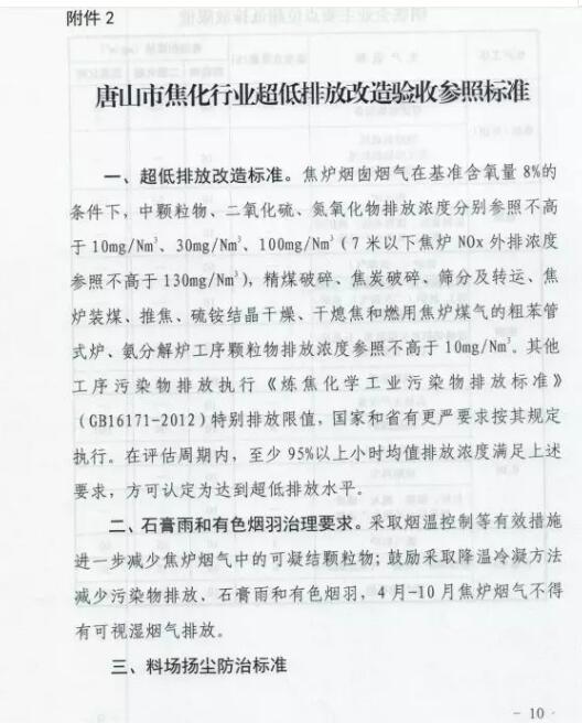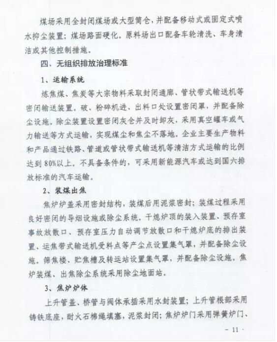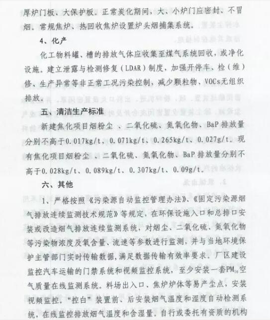2018年9月底前,全市所有焦化企業(yè)全部達到超低排放水平(限值參照驗收標準,通過168小時運行且第三方監(jiān)測達標,95%以上小時均值排放達標),并完成濕煙氣脫白治理改造,凡達不到標準的實施停產(chǎn)整治