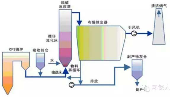 以循環流化床原理為基礎,通過物料的循環利用,在反應塔內吸收劑、吸附劑、循環灰形成濃相的床態,并向反應塔中噴入水,煙氣中多種污染物在反應塔內發生化學反應或物理吸附;經反應塔凈化后的煙氣進入下游的除塵器,進一步凈化煙氣。此時煙氣中的SO2和幾乎全部的SO3,HCl,HF等酸性成分被吸收而除去,生成CaSO3•1/2H2O、CaSO4•1/2H2O等副產物。